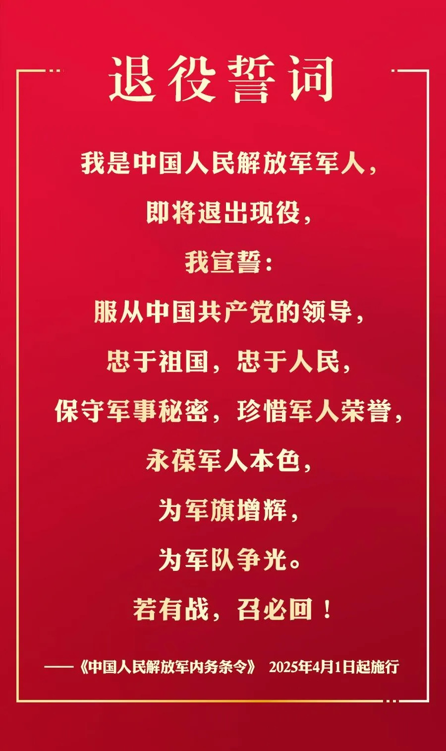 編者的話(huà): 26日,解放軍報在頭版刊發(fā)《中國人民解放軍內務(wù)條令》,條令中明確公布退役誓詞。 第十五條…